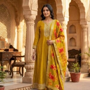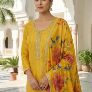 Mustard Silk Floral Digital Printed Three Piece set