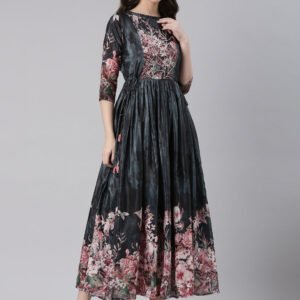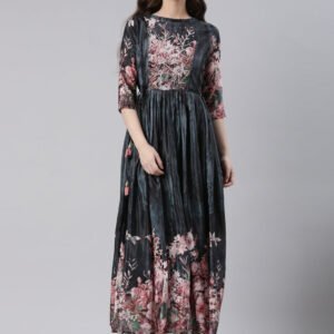 Neerus Grey Casual Floral Maxi Dresses